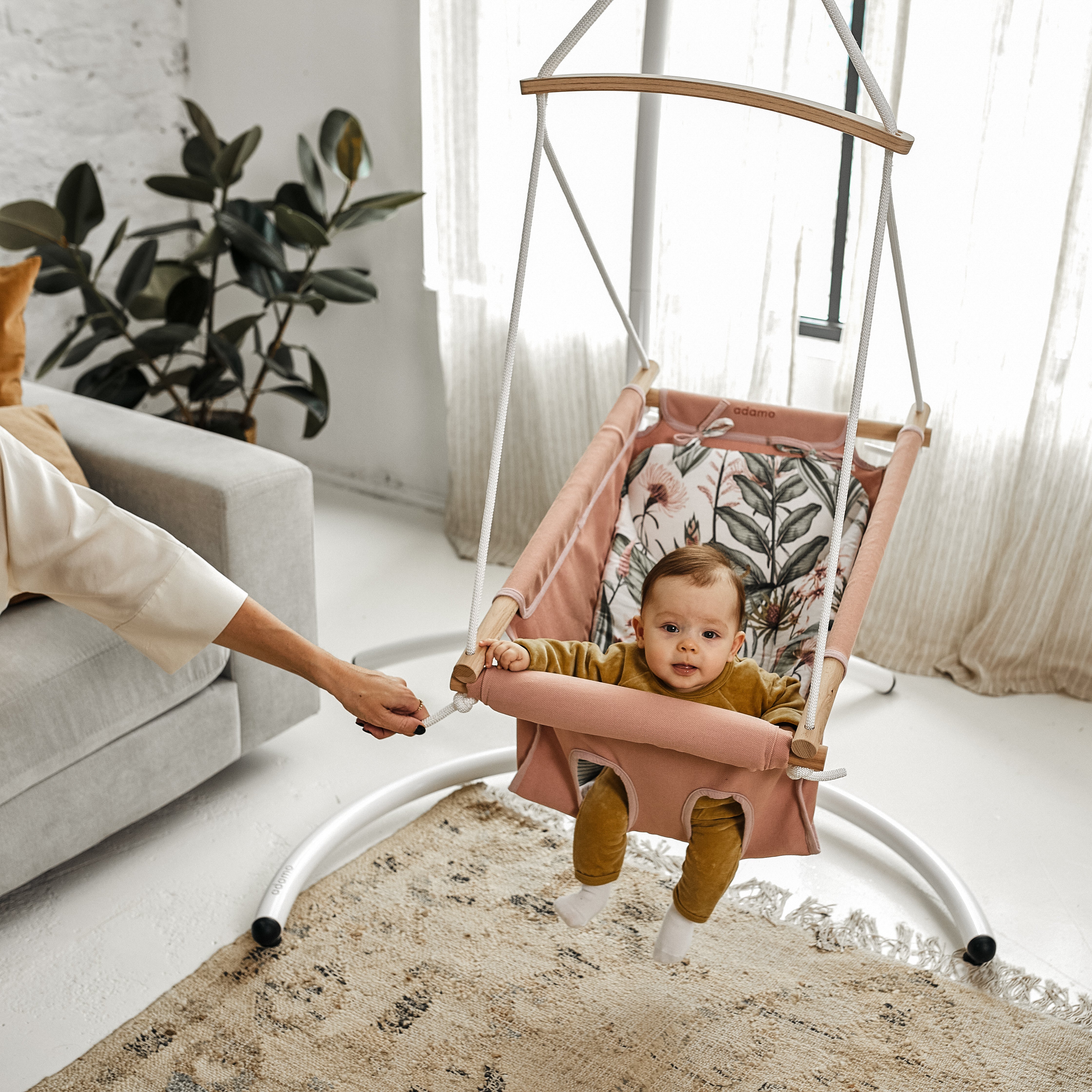 Az első találkozás a hintával nagyon fontos és meghatározó élménye a babának. Lehetőleg időzítsük úgy, hogy a baba ne legyen fáradt vagy éhes. Az első hintázáskor érdemes a babának megmutatni az ADAMO hintát, illetve mondjuk el neki, hogy mi fog pontosan történni. Térdeljünk le vagy guggoljunk le úgy, hogy a babahintával felsőtestünk egy magasságba kerüljön, mindezt a hintával szembe elhelyezkedve tegyük, úgy, hogy a lábkivágás velünk szemben legyen. Tartsuk a szemkontaktust a babával és óvatosan a hinta magasságához leereszkedve tegyük bele a kisbabánkat. Legyünk nyugodtak, sugározzuk, hogy jó dolog fog történni, és nevessünk vagy mosolyogjunk babánkra. Fontos, hogy elsőre sosem hintáztatunk hanem inkább ringassuk a babát. Ha szépen fokozatosan hozzászoktatjuk a hintához, később lehet majd lendületesen hintáztatni, de ez sosem az első alkalommal történjen. Érdemes a babahintát a kisded súlyának megfelelő rugóval kiegészíteni, és a ringatás közben finom fel-le mozgatással megismertetni a babát.